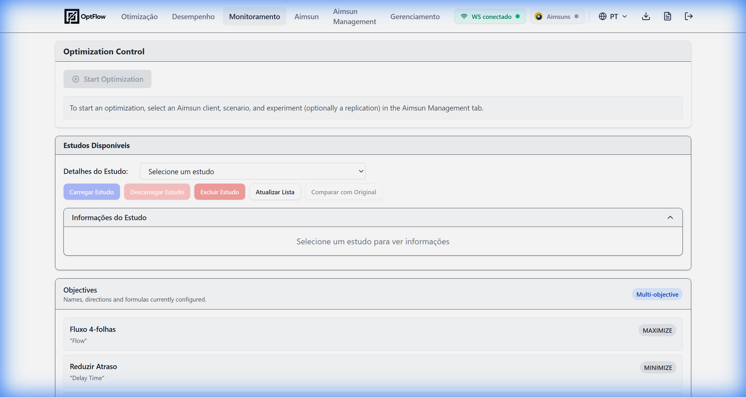 O OptFlow oferece uma interface de monitoramento completa que permite acompanhar o progresso da otimização em tempo real, visualizar resultados parciais e controlar o processo de otimização.