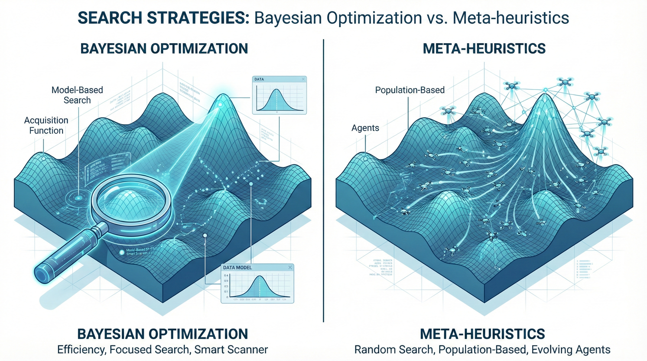 - Meta-heurísticas/Evolucionários (CMAES, Simulated Annealing): Baseiam-se na melhoria iterativa, muitas vezes com mecanismos probabilísticos para explorar o espaço, sem um modelo explícito da função objetivo como os Bayesianos.